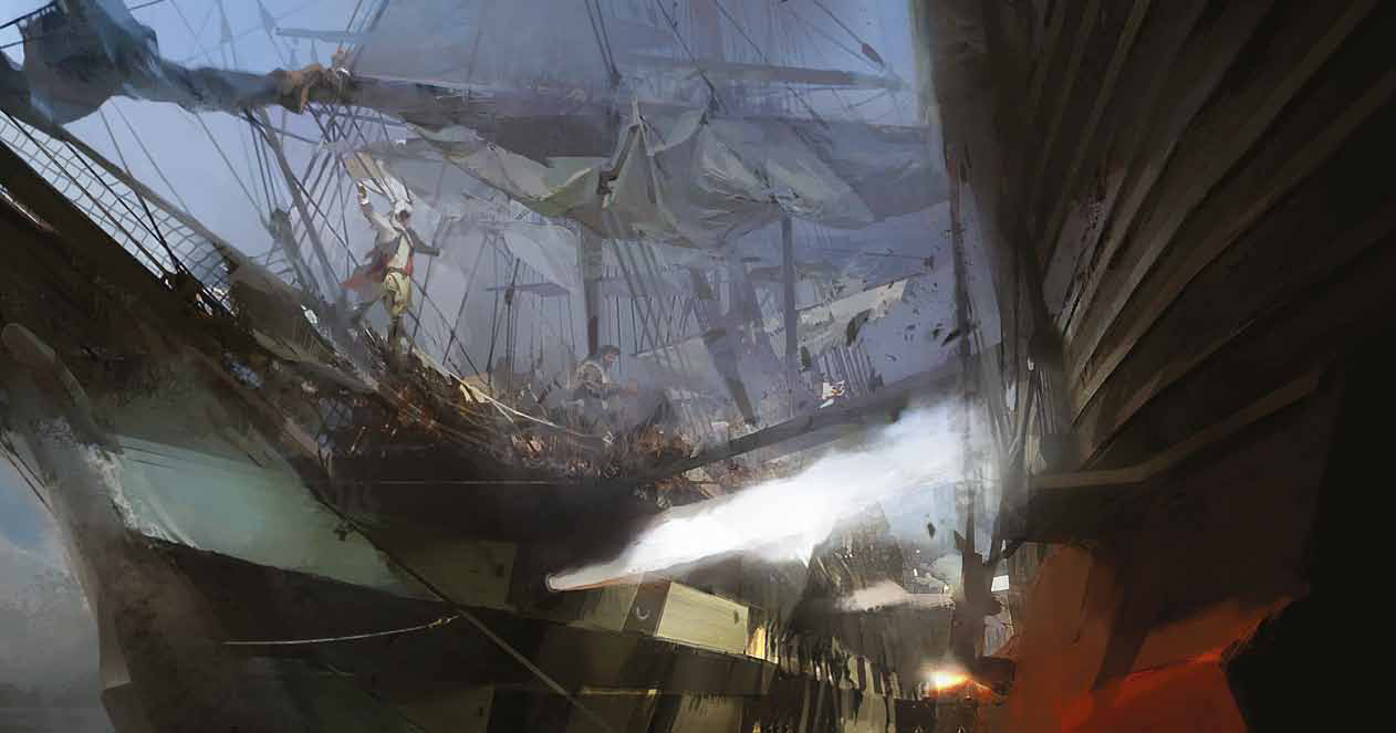 One aspect of the game that many people were excited about but never blew me away was the naval battle mechanic. Maybe it has to do with being born and raised on the waters of New England but the ship-centric parts never drew me in while playing the game. The artwork on the other hand though is some of the most impressive of the book. The full page spreads showing the waters of a storm beautifully capture the feel of the New England area during storm season as well as its calmer and more serene moments. If given the chance to purchase any of the original concept art, these would be the pieces I’d flock to instantly.