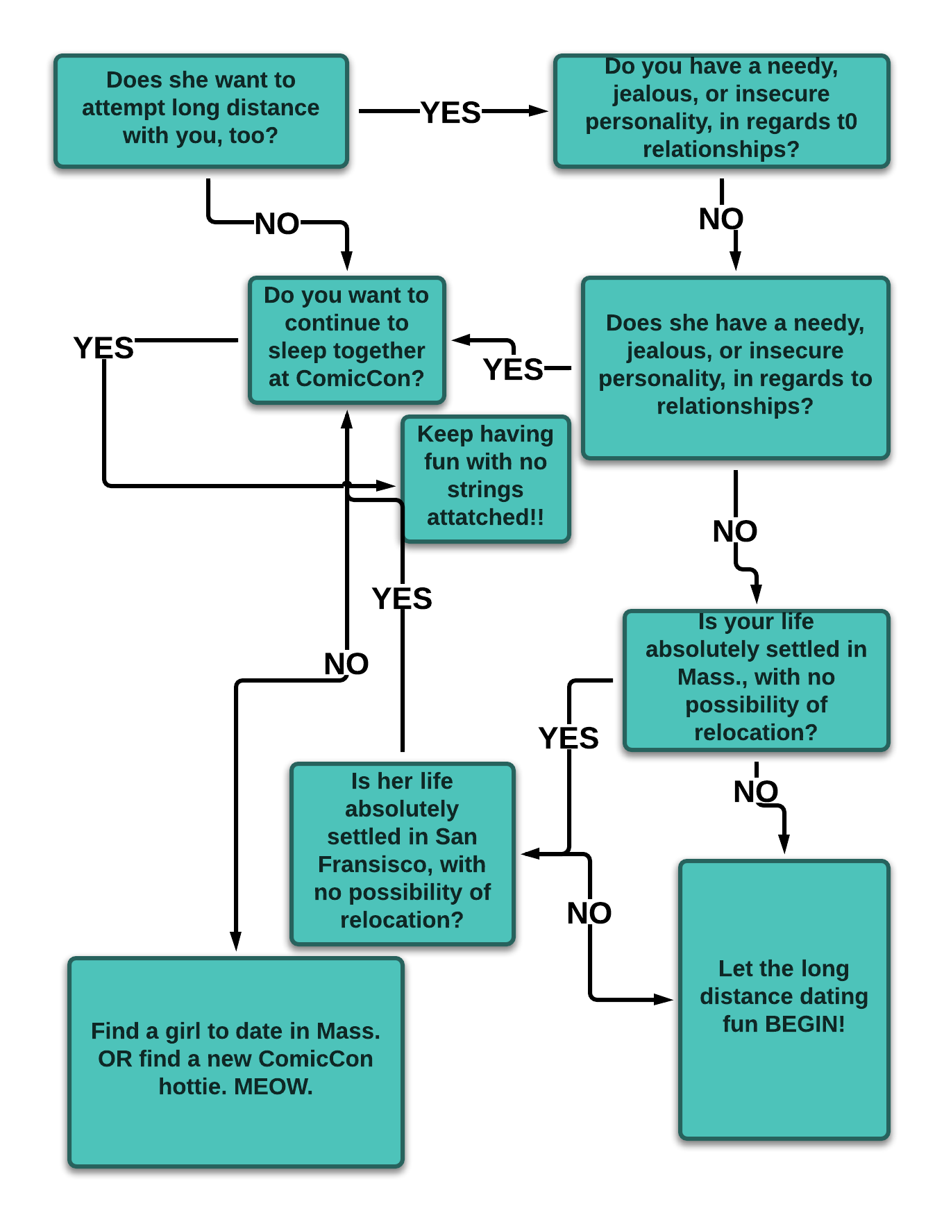 For the past few years, I have gone down to Comic Con and there is a girl I have hooked up with the past few years down there. We get along great and keep in touch throughout the year and like clockwork we end up together in San Diego. I could totally see dating her. The problem is I am from Massachusetts and she lives in San Francisco. – LongDistanceTrouble