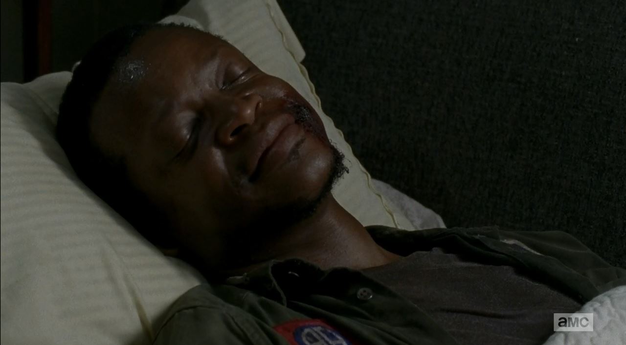 Sasha is with Bob now. He wakes up from a dream where Sasha was smiling at him. Sasha asks Bob what the good is that will come out of this bad. Bob doesn’t answer. He’s dead. Tyreese comes in and takes the knife from Sasha and asks her to leave the room. He kills Bob’s brain.